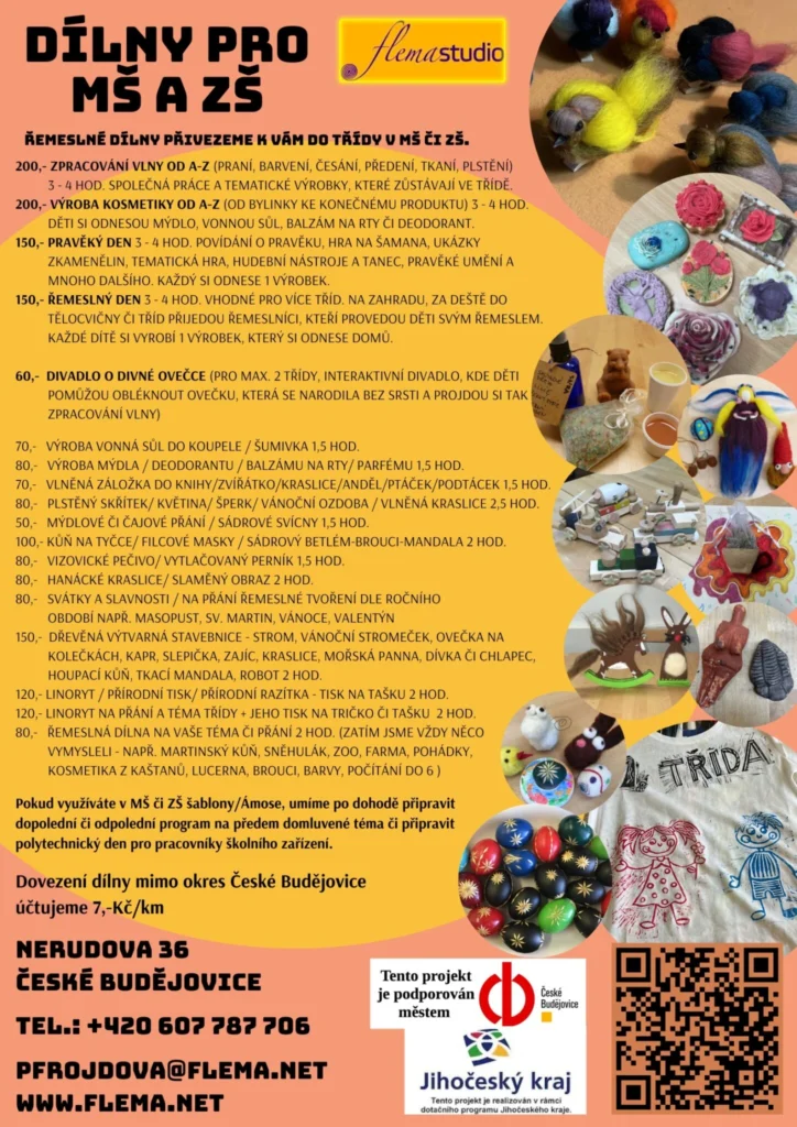 Nabízím řemeslné dílny s dovozem do Vaší třídy v MŠ či ZŠ po domluvě lze připravit i složitější dílny pro II.stupeň ZŠ nebo SŠ dle zaměření. Při dojezdu z Českých Budějovic nad 50km, účtujeme poplatek na dopravu 7,-Kč/km.
