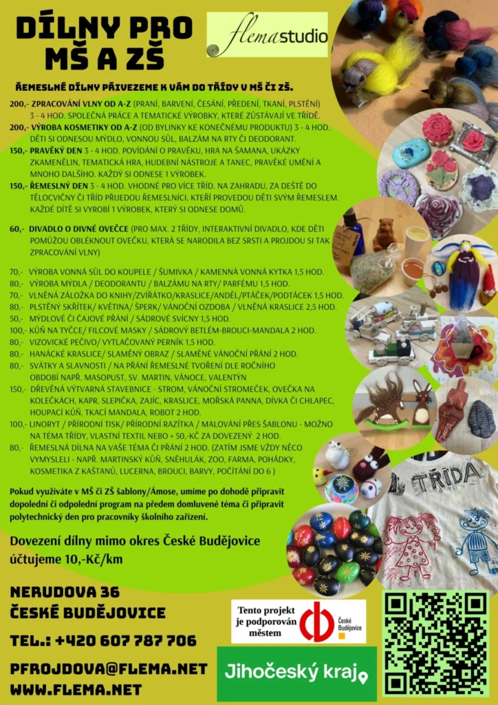 Nabízím řemeslné dílny s dovozem do Vaší třídy v MŠ či ZŠ po domluvě lze připravit i složitější dílny pro II.stupeň ZŠ nebo SŠ dle zaměření. Při dojezdu z Českých Budějovic nad 20km, účtujeme poplatek na dopravu 10,-Kč/km.