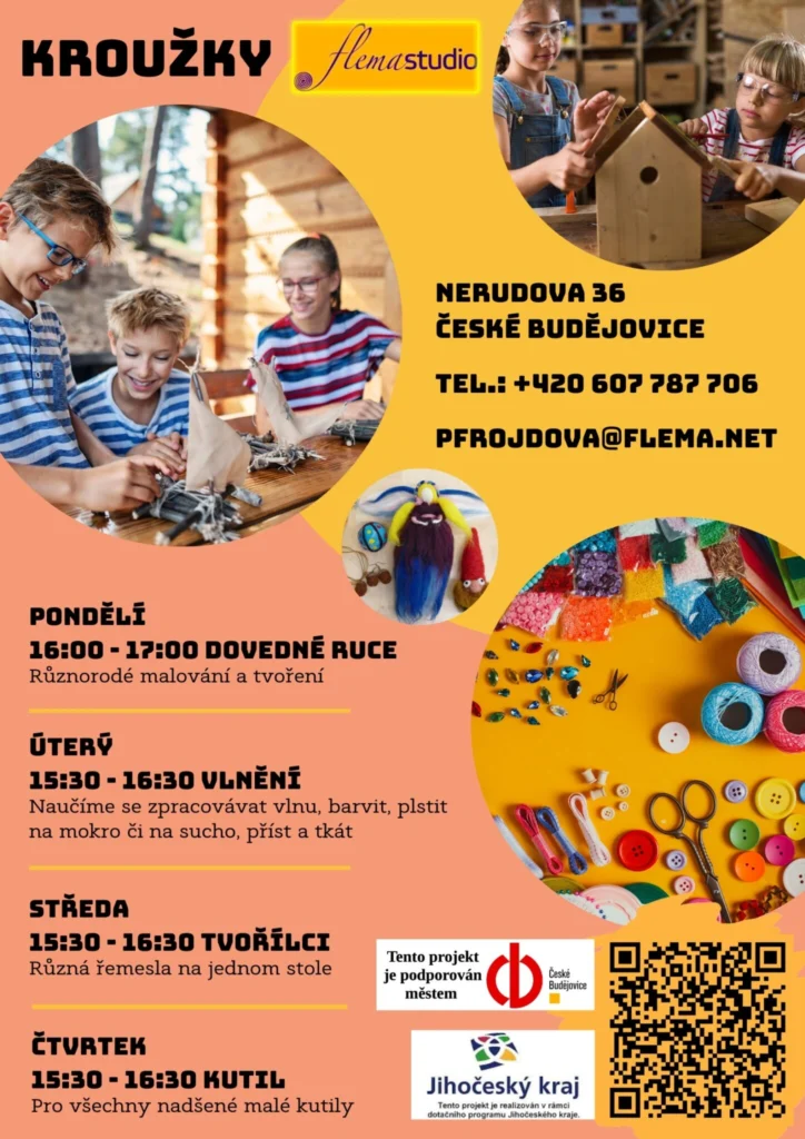 Pravidelné kroužky ve školním roce 2024/2025. Dílny se nachází na adrese: Nerudova 36, České Budějovice (za IGY). Kontakt je: Petra Frojdová tel.: 607 787 706 nebo pfrojdova@flema.net. Platba kurzovného na BÚ 264747044/2700 nebo hotově či kartou na kroužku.